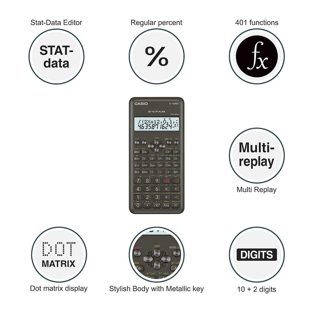 Non programmable number of functions: 240 aaa × 1 (r03) digit: 10 + 2 digits (10-digit mantissa + 2-digit exponential display)dot matrix display: high-resolution screen provides beautiful looking graphs every timemulti-replay: quick and easy recall of previously executed formulas for editing and re-executionplastic keys: designed and engineered for easy operations-v. P. A. M. (Super visually perfect algebraic method): all the features of the existing v. P. A. M. Series plus a new 2-line display and a useful replay function. All this helps to make mathematics easier to use and easier to understand than ever before. Stat-data editor: back-step viewing and editing of input dataaaa-size batterynon graphingbasic statistics: standard statistics functions such as mean, sum, standard deviation, and regression basic mathematical functions: trigonometric, exponential logarithmic, etc. Dimensions(d × w × h): 161. 5×77×13. 8mm weight: 105g.