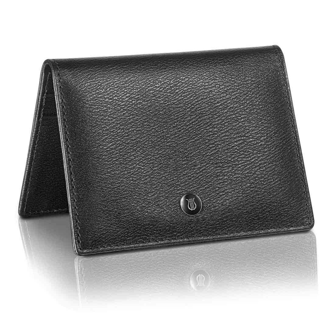 Keep your essentials close at hand with the Belgravia credit card holder. The Belgravia card holder is created for those who find a traditional wallet cumbersome to carry. Slim and compact, the design of the Belgravia card holder is finished in top grain Italian leather with monogrammed jacquard silk lining. Equipped with 3 card slots, a slip in pocket to keep a few folded currencies and an ID pocket making it an everyday accessory to carry your most-used cards. Smoothly rounded corners minimizes the wear and tear around the edges. The exterior is embellished with the Lapis Bard Lyre logo in black and silver finish. Presented in Lapis Bard's signature blue gift box.